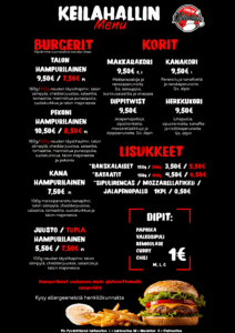 Keittiöstämme saat maistuvia suolaisia annoksia ja naposteltavia mm. kanakori, makkarakori, hampurilaisia, ranskalaisia ym.
